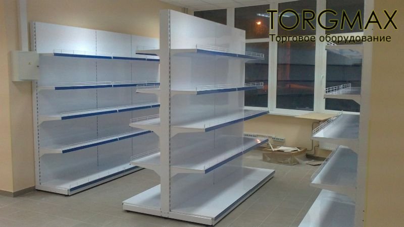 Секция стеллажа двухстороннего стандарт состоит из Т-образной стойки, 2-х подиумов, панелей подиумов, задних панелей. Островные стеллажи, как правило, используют для продажи продуктов питания, бытовой химии, товаров промышленного производства в магазинах самообслуживания. Наиболее выгодно распологать такую стеллажную линию по средине торгового зала, за счет огромной выставочной площади и доступности товара, привлекается большой покупательский поток.