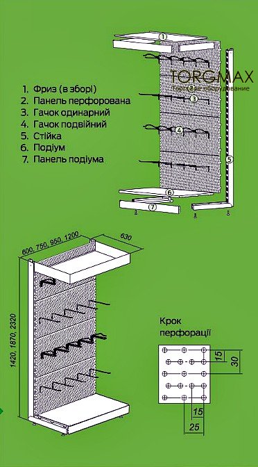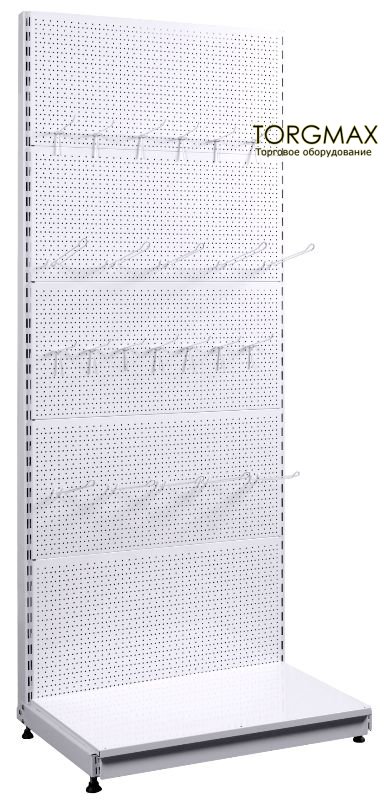 Секция Стеллажа Стандарт с перфорацией задних панелей состоит из стойки, подиума, панели подиума, задних перфорированных панелей. Шаг перфорации задней панели равен 25 мм вширину и 30 мм ввысоту. Как правило, перфорированный стеллаж используют для демонстрации и продажи навесных товаров, которые размещаються на крючках.