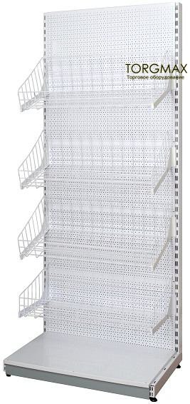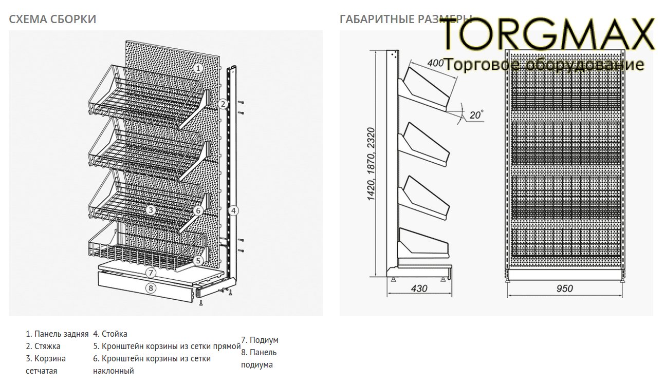 Секция стеллажа с сетчатыми корзинами состоит из стойки (2350*400 мм), перфорированных задних панелей в кол-ве 5шт, 950 мм, подиума (950*400 мм), панели подиума 950, корзин сетчатых в кол-ве 4шт и кронштейнов 8 шт. Размер корзины 950*400, есть возможность ставить под углом.