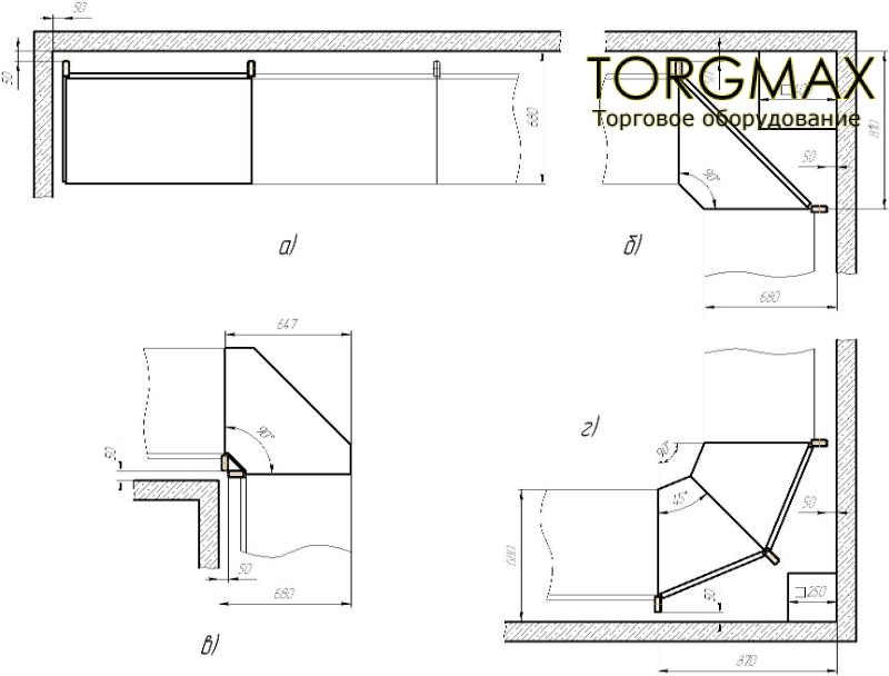 При установке внешнего угла важно знать, что при размере подиума 50см, он занимает 68см длины от стены помещения. Сборку стеллажной линии необходимо начинать с угловой секции.