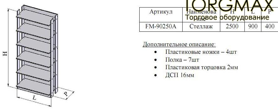 Торговый стеллаж FM-90250А производится в стандартном размере и цвете, указанных в характеристике товара. Цвет исполнения, по умолчанию, белый RAL 9016 или "вишня". За не стандартный цвет покраски ДСП, стоимость стеллажа увеличивается на 10%.