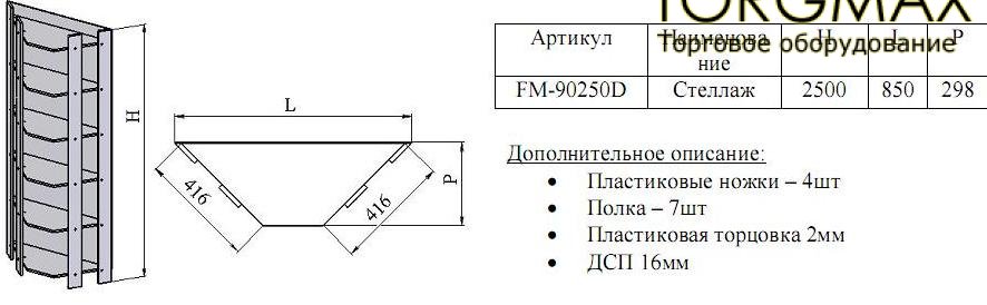 Торговый стеллаж угловой внутренний FM-90250D производится в стандартном размере и цвете, указанным в характеристике товара. Цвет исполнения, по умолчанию, белый RAL 9016 или "вишня". За не стандартный цвет покраски ДСП, стоимость стеллажа увеличивается на 10%.